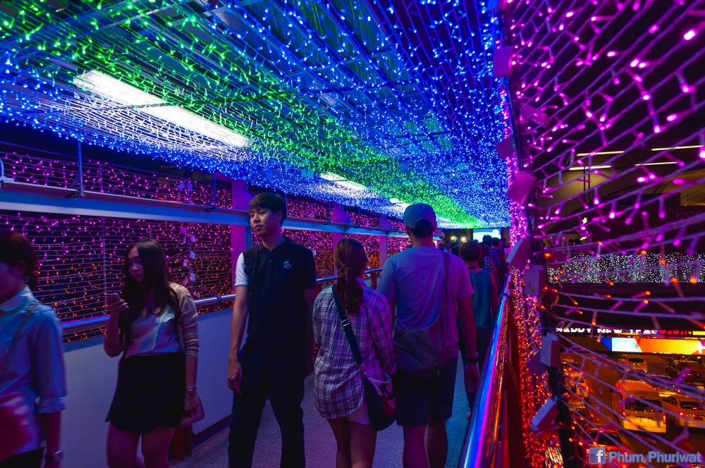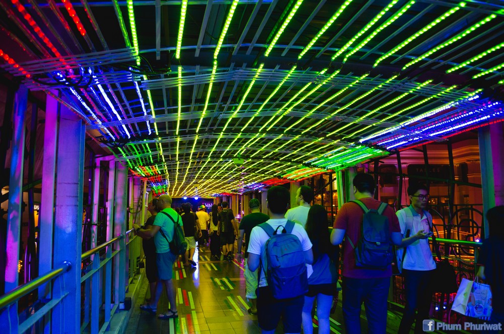 สกายวอล์คแยกราชประสงค์ ที่ถูกเนรมิตให้เป็นอุโมงค์แห่งแสงไฟ จัดงาน “Thailand The Kingdom of Light 2”