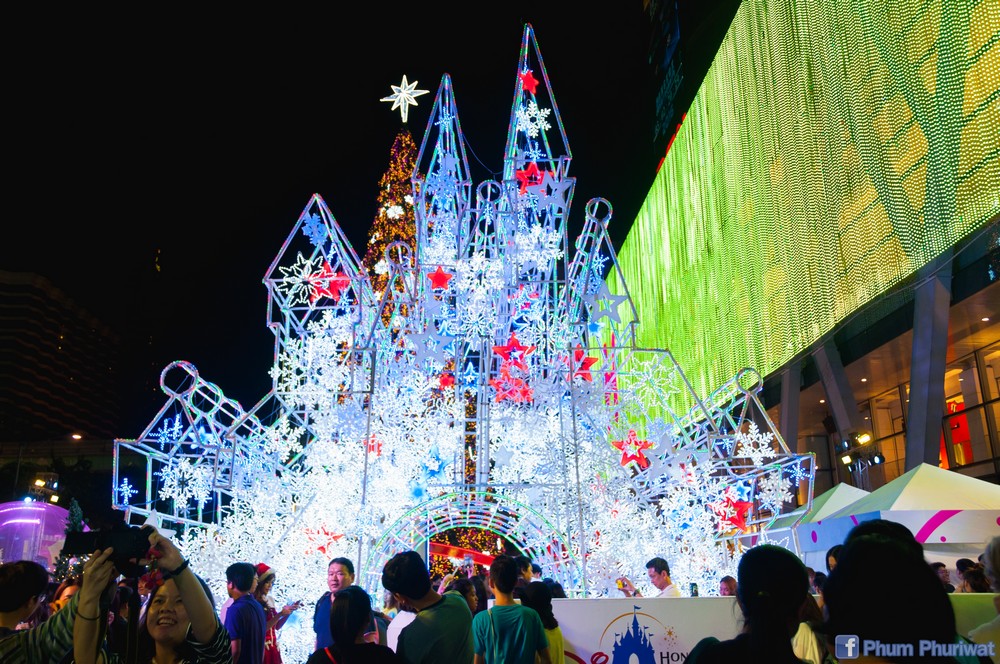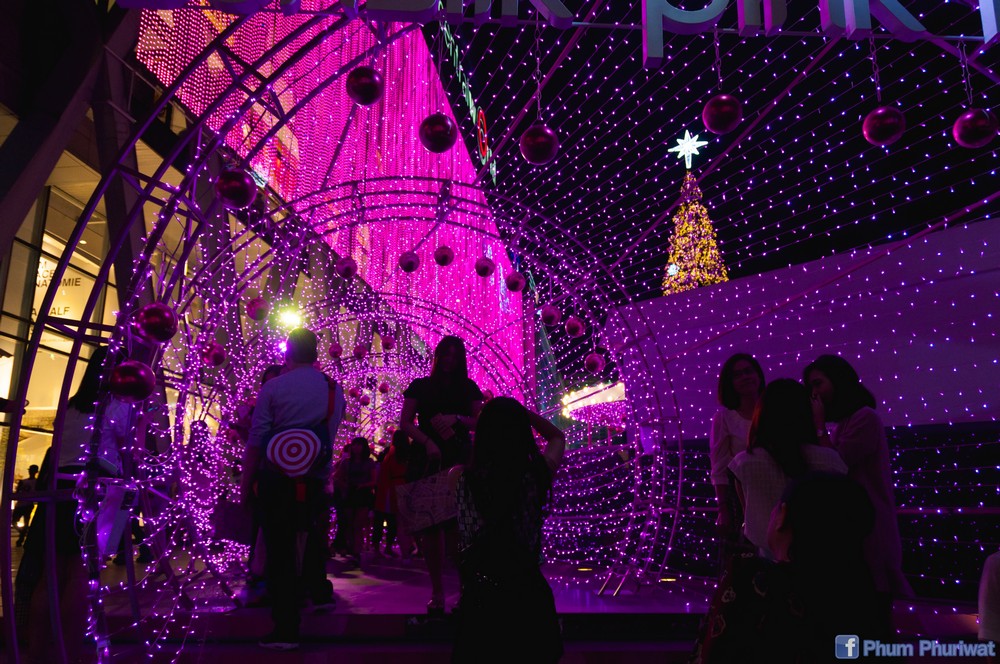 เริ่มจากสถานที่แรกคือ สยาม พารากอน ห้างสรรพสินค้าใจกลางกรุงเทพฯ เมื่อเดินไปด้านหน้าห้างก็จะเห็นซุ้มของต้นคริสต์มาสที่ประดับประดาได้อย่างสวยงามเป็นระยะทางกว่าร้อยเมตร อีกทั้งยังมีที่นั่งใต้ซุ้มให้ผู้คนที่ผ่านไป-มาแวะเวียนมานั่งพักพร้อมถ่ายรูปคู่กับซุ้มดังกล่าว เชื่อเลยว่าความระยิบระยับของต้นคริสต์มาสและซุ้มไฟจะทำให้คุณตื่นตาตื่นใจแน่นอน